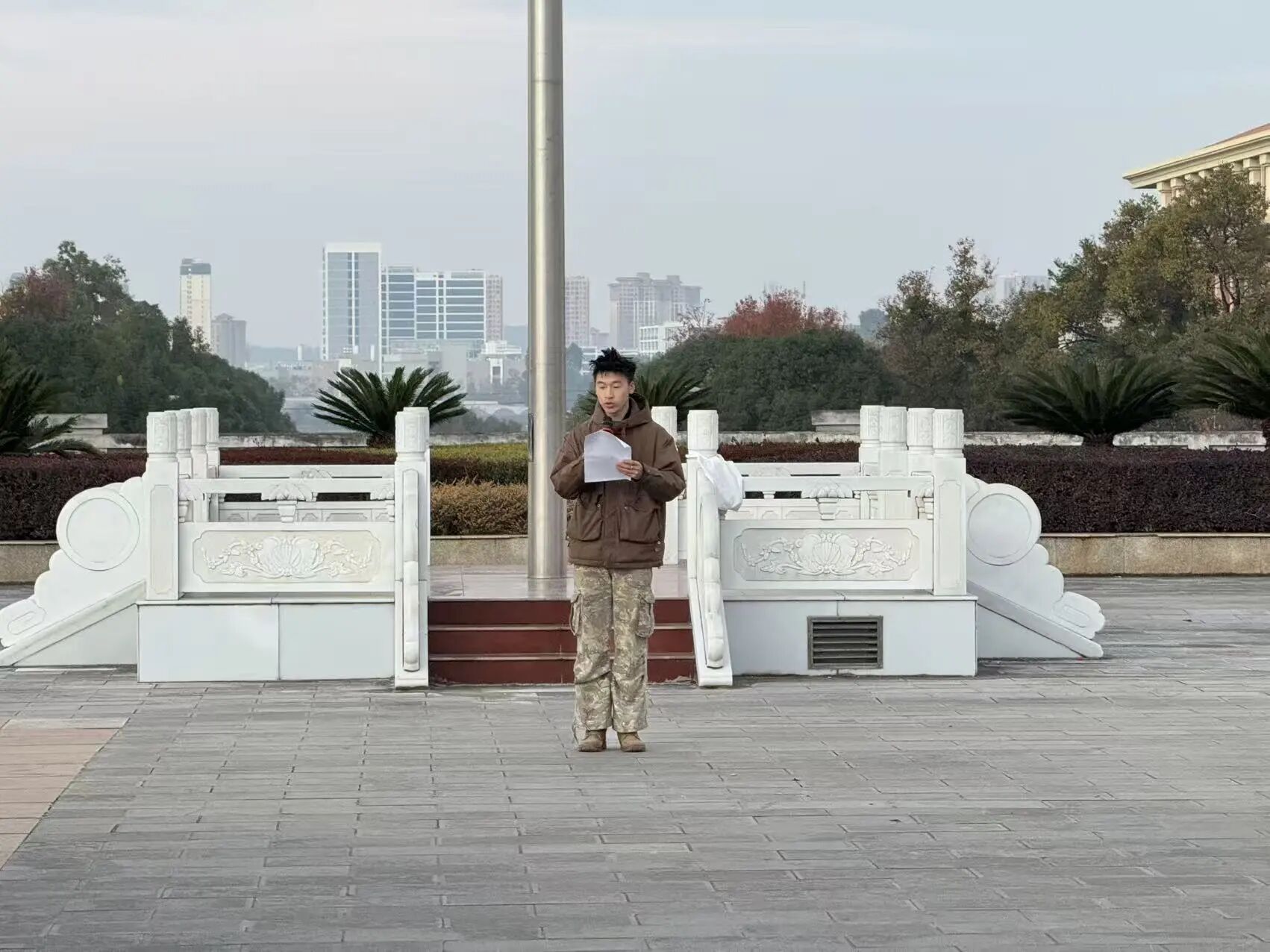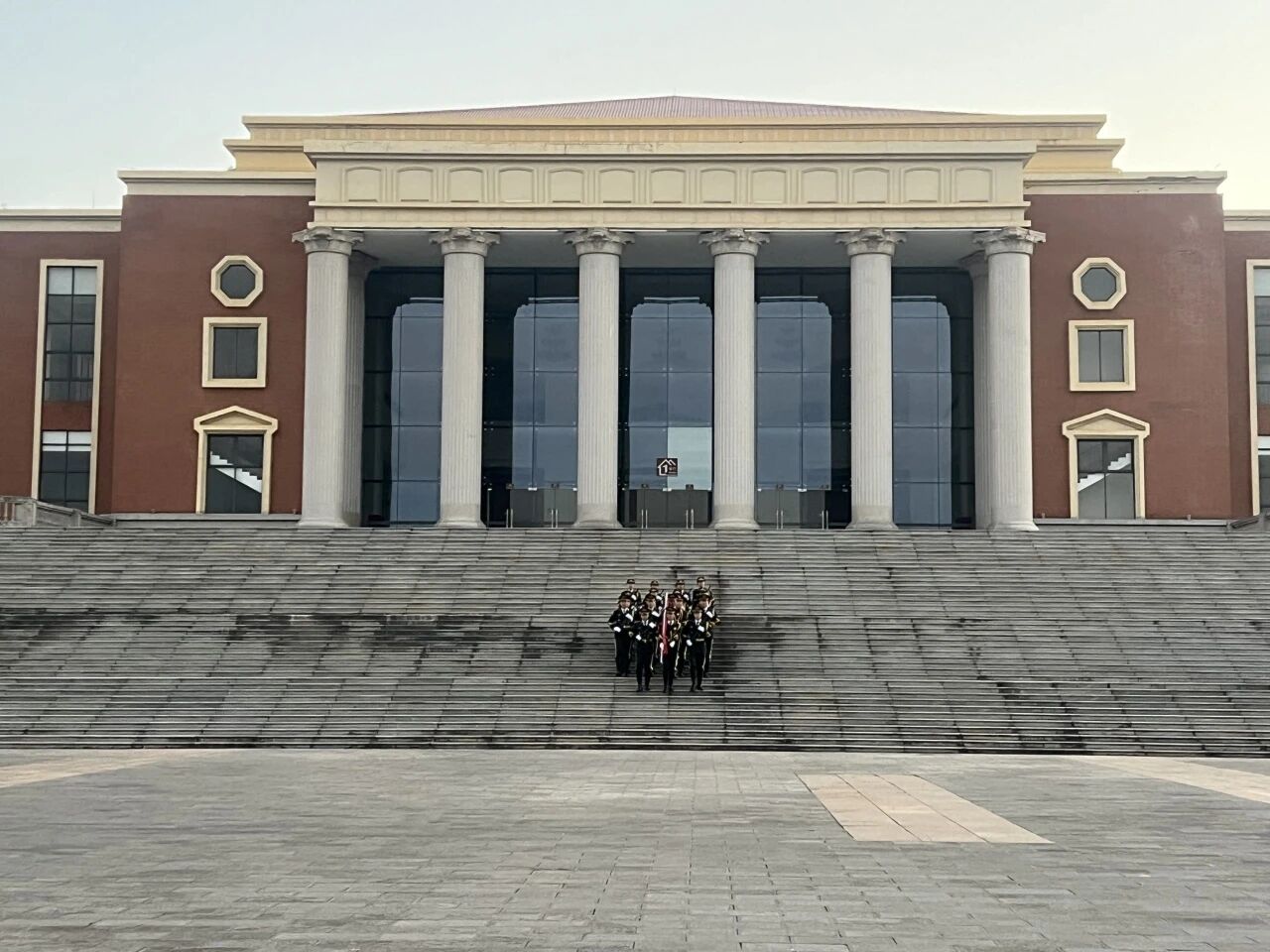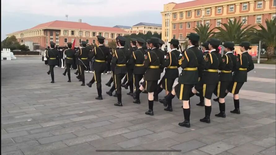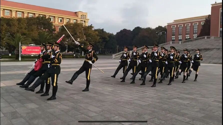 在嘹亮的口令声中,国旗护卫队迈着铿锵有力的步伐整齐入场,队列如铸、步履坚定,护卫着鲜艳的五星红旗庄严走向升旗台。“向国旗——敬礼!”,护旗手们擎旗、展旗、升旗,动作干净利落、节奏铿锵如一。伴随着《义勇军进行曲》雄壮的旋律,全体师生肃立凝视、齐声高唱,五星红旗在晨风中冉冉升起,映照着每一个挺拔庄重的身影。