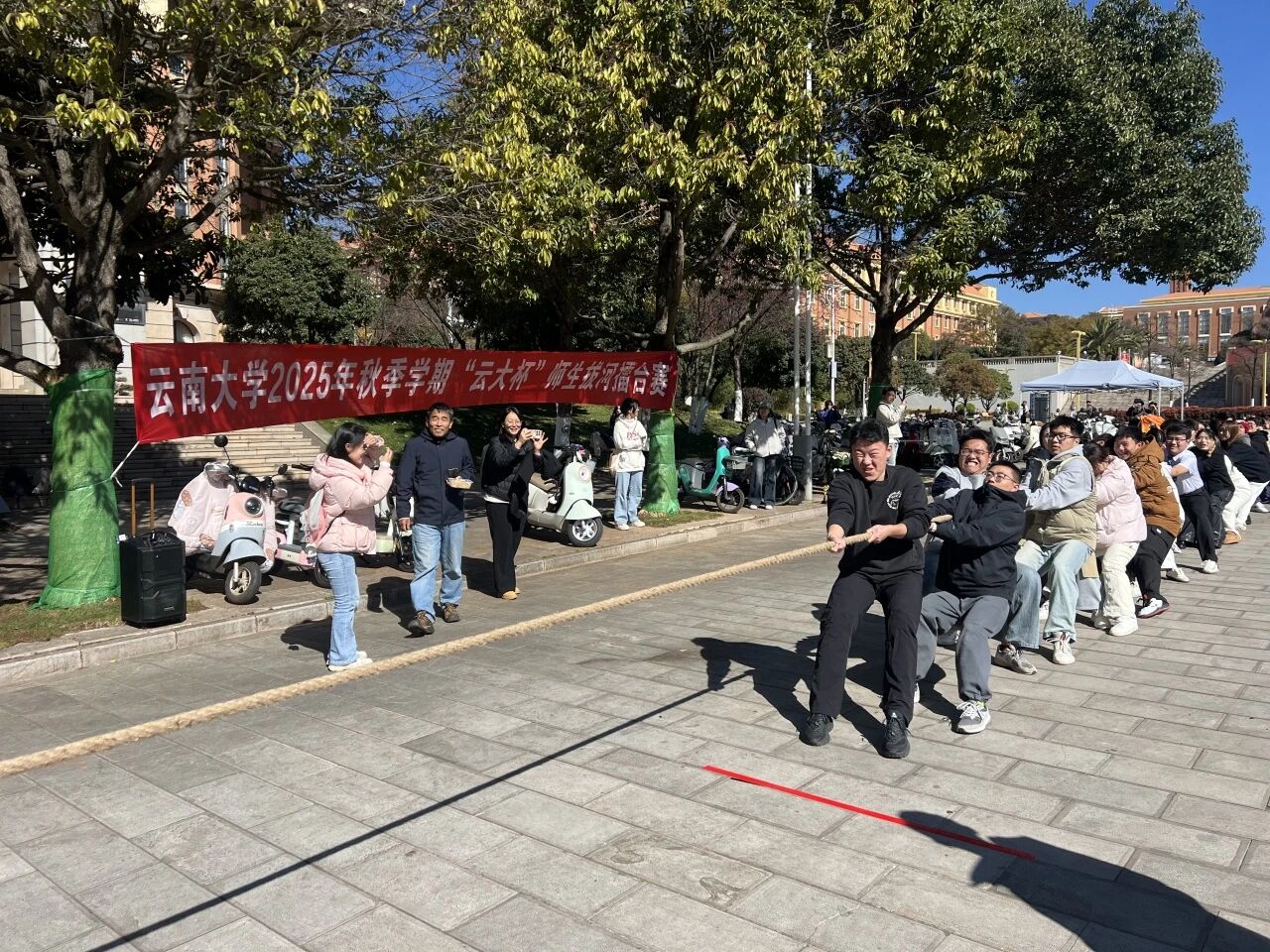 为丰富师生校园生活、增进团队凝聚力与协作精神,营造活力健康、积极向上的校园体育文化氛围,生动展现必赢网络游戏平台师生团结拼搏、锐意进取的精神风貌,在各学院、各单位的大力支持与协同配合下,2025年秋季学期“云大杯”师生拔河擂台赛自第十六周启动以来,历时多轮激烈角逐,于2025年12月31日圆满落下帷幕。