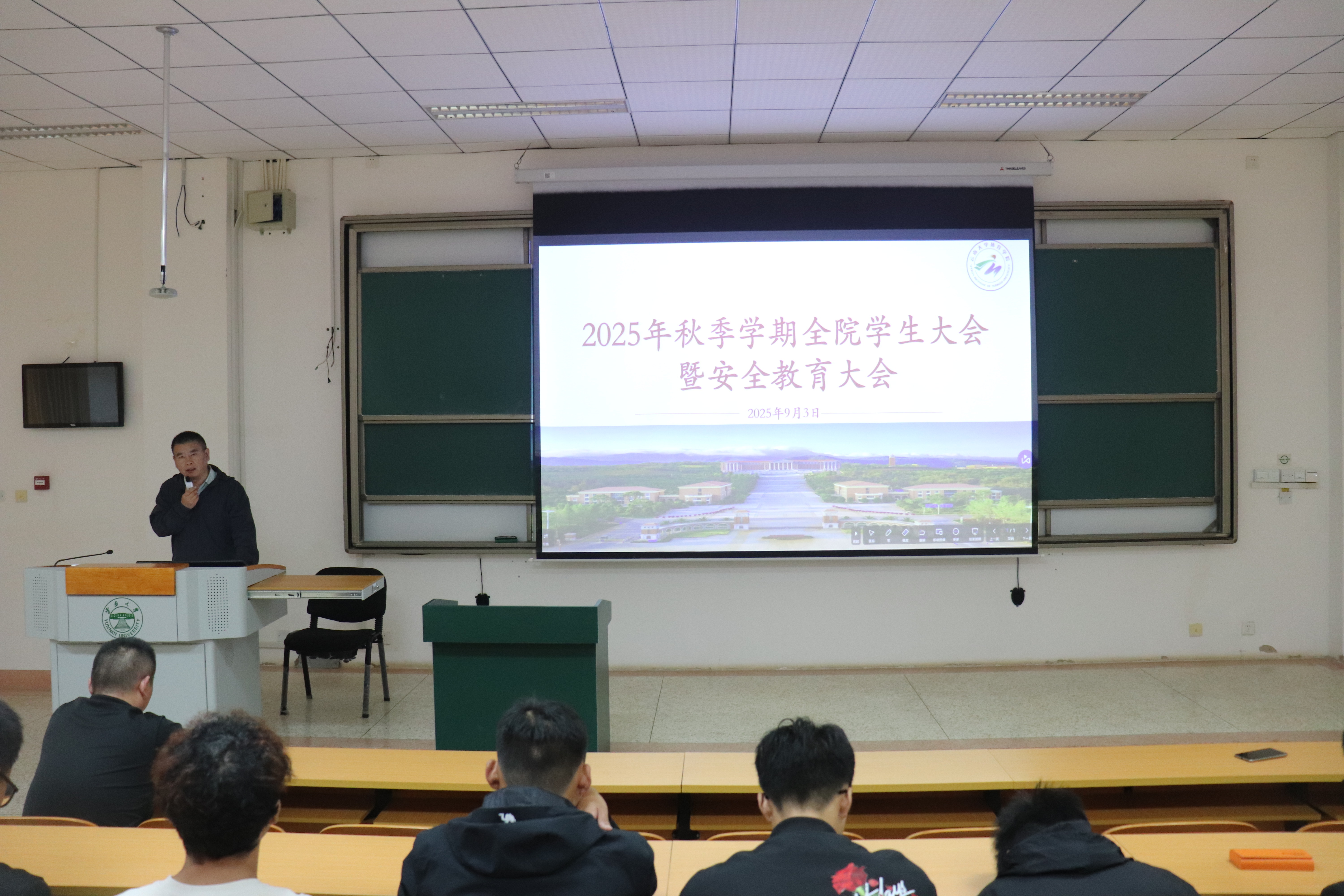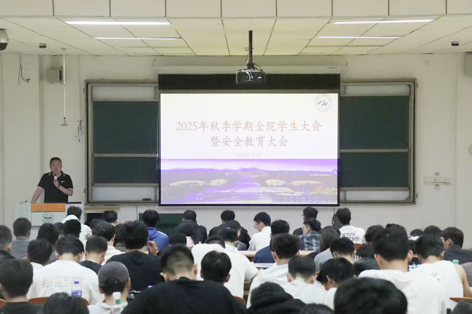 2025年9月3日,必赢网络游戏平台于文汇楼2218召开2025年秋季学期全院学生大会暨安全教育大会。学院党委书记王帆、副书记刘正之,各年级班主任、辅导员和全体学生参加会议,会议由刘正之副书记主持。