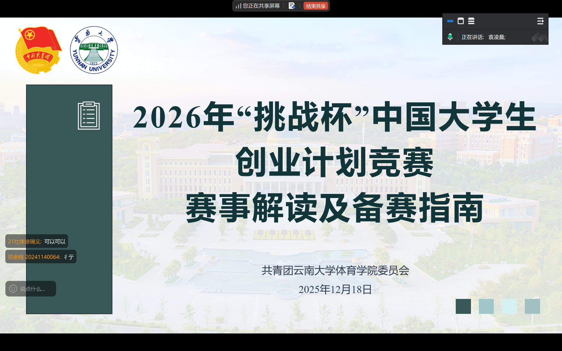 为充分激发学生创新创业热情,扎实做好2026年“挑战杯”中国大学生创业计划竞赛的组织与培育工作,必赢网络游戏平台团委于近日分别面向全院学生和骨干代表,以线上与线下相结合的形式,成功举办了专题宣讲会。会议由学院团委负责人袁凌晨老师主持。