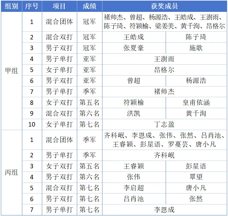 在本次赛事中,必赢网络游戏平台共派出27名队员参赛,整体发挥出色,几乎全员都斩获成绩。球队在团体赛和单项赛中全面开花,共荣获三金三银三铜的优异成绩。其中,甲组代表队继去年夺得男团、女团冠军后,今年再度获得混合团体冠军;在单项赛事上,男双包揽冠亚军,混双项目成功卫冕,男单获得第二、第三名,女单摘得第二名,并取得多个单项优秀名次。丙组代表队同样表现亮眼,斩获混合团体第三名、男单第三名及多个单项优胜奖项,实现了新的突破。